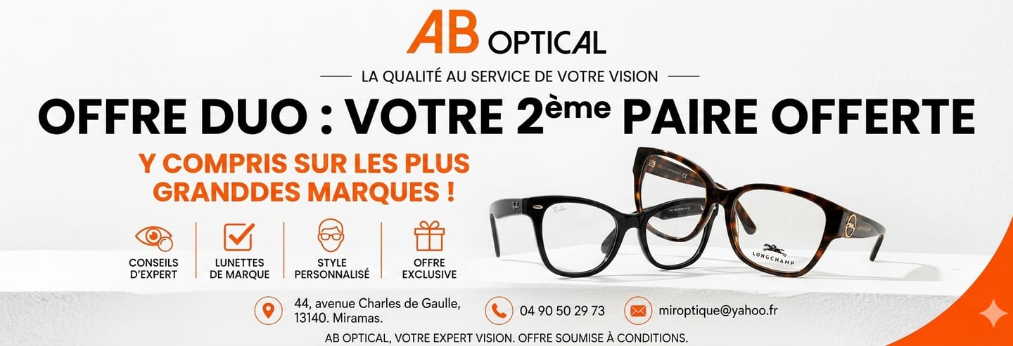 Achetez une paire, la deuxième est offerte chez AB Optical, votre opticien à Marseille et Miramas.
