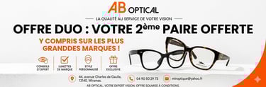 Chez AB Optical, nous comprenons parfaitement que vos lunettes ne sont pas seulement une correction visuelle, mais plutôt une véritable extension de votre personnalité unique et de votre style de vie. Pour vous permettre de varier les plaisirs sans aucun compromis, nous sommes donc particulièrement ravis de vous présenter notre offre duo exclusive : "LES DEUX FONT LA PAIRE". Cette proposition innovante vise à vous apporter autant de choix que de plaisir en matière de lunettes, ce qui est essentiel dans le monde d'aujourd'hui.